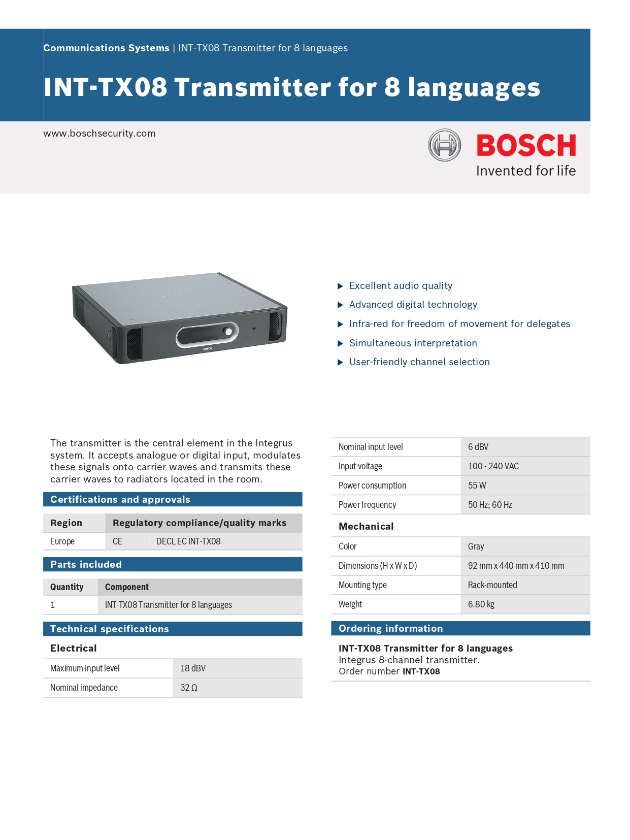- Bosch INT-TX08 Có thể sử dụng với Hệ thống kỹ thuật số DCN NG hoặc hệ thống hội thảo CCS 900
