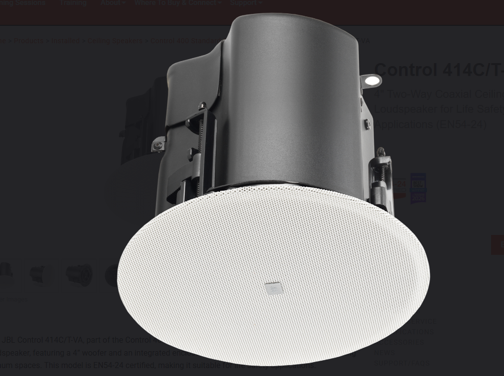 The JBL Control 414C/T-VA, part of the Control 400 Standard Coverage Series, is a two-way coaxial ceiling loudspeaker, featuring a 4” woofer and an integrated enclosure that is ideal for installation in most ceiling plenum spaces. This model is EN54-24 certified, making it suitable for life safety applications.