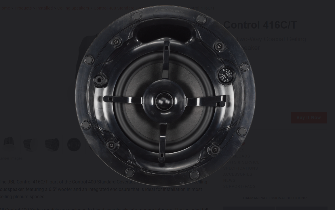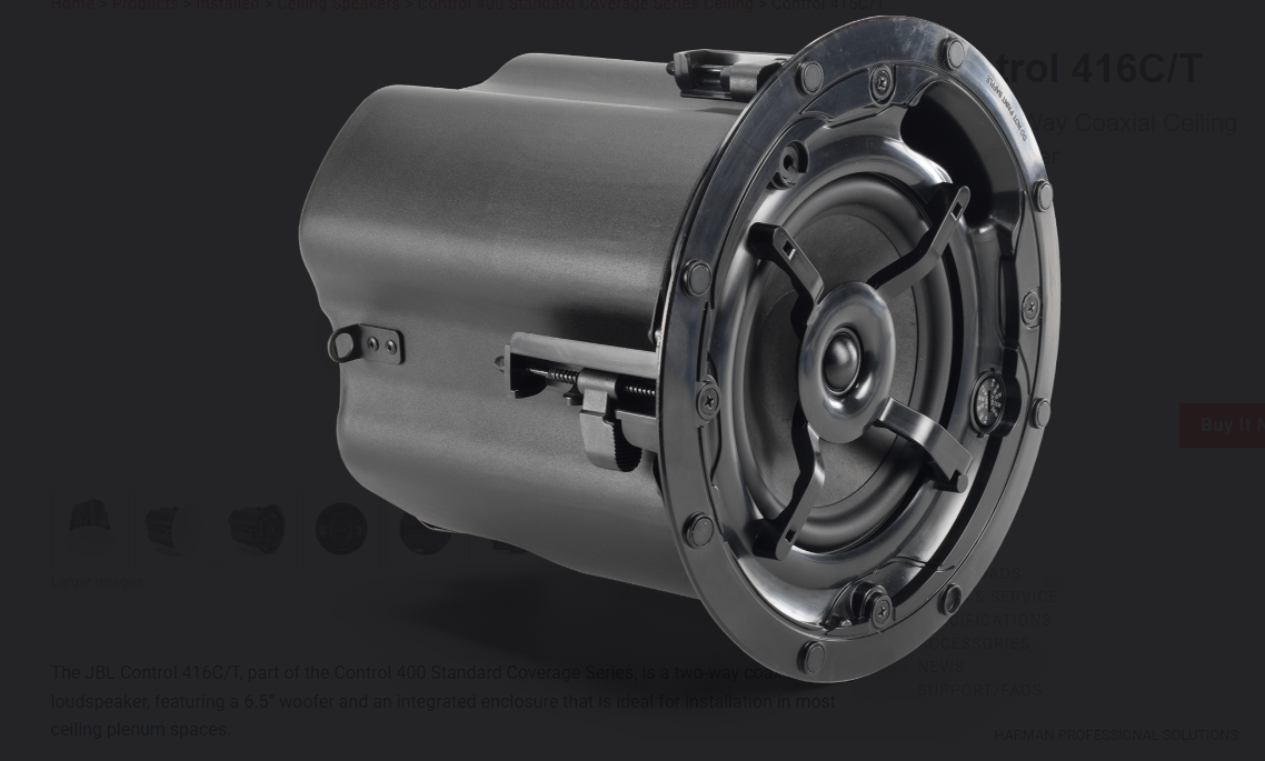 The JBL Control 416C/T, part of the Control 400 Standard Coverage Series, is a two-way coaxial ceiling loudspeaker, featuring a 6.5” woofer and an integrated enclosure that is ideal for installation in most ceiling plenum spaces.