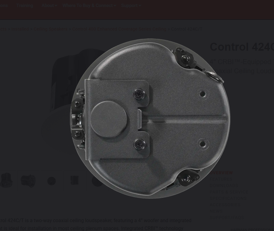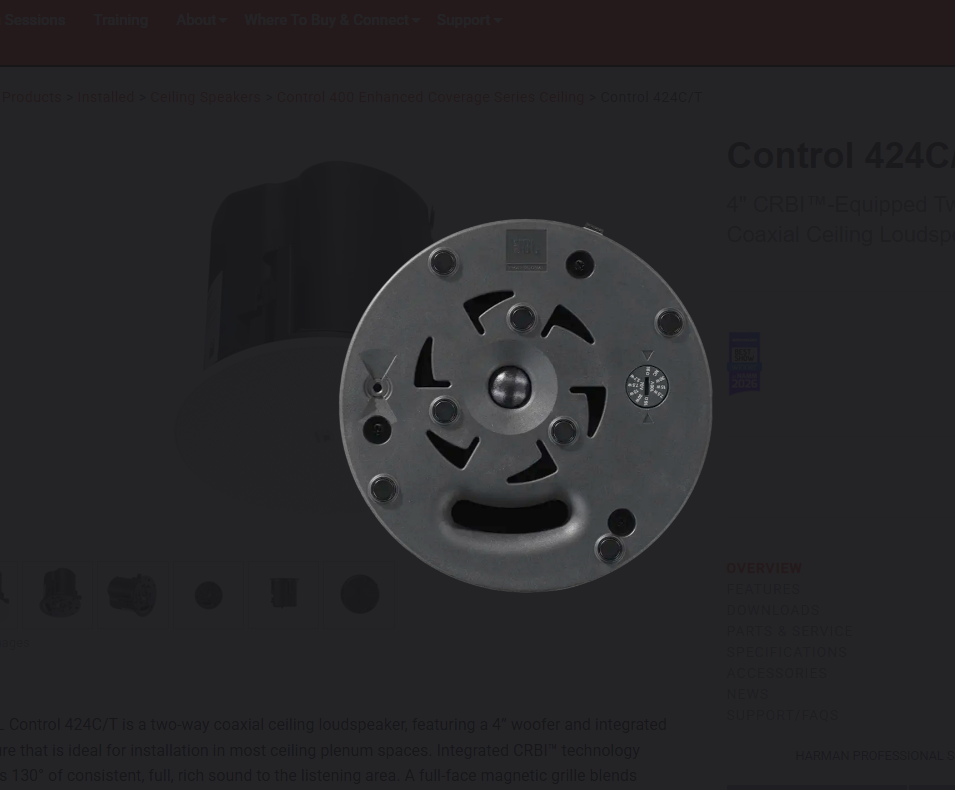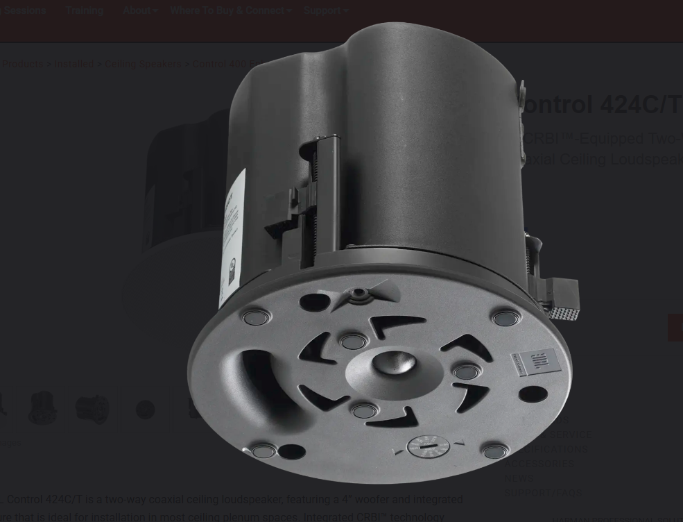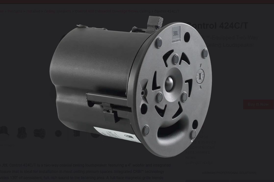 The JBL Control 424C/T is a two-way coaxial ceiling loudspeaker, featuring a 4” woofer and integrated enclosure that is ideal for installation in most ceiling plenum spaces. Integrated CRBI™ technology provides 130° of consistent, full, rich sound to the listening area. A full-face magnetic grille blends seamlessly with modern decors and optional black and square grilles are available. Mechanical improvements include redesigned terminal covers with top and side cable entry ports and an extremely reliable new dogear design that works with a wide range of ceiling thicknesses. The JBL Control 424C/T includes a transformer to support both 70V/100V and low impedance applications.