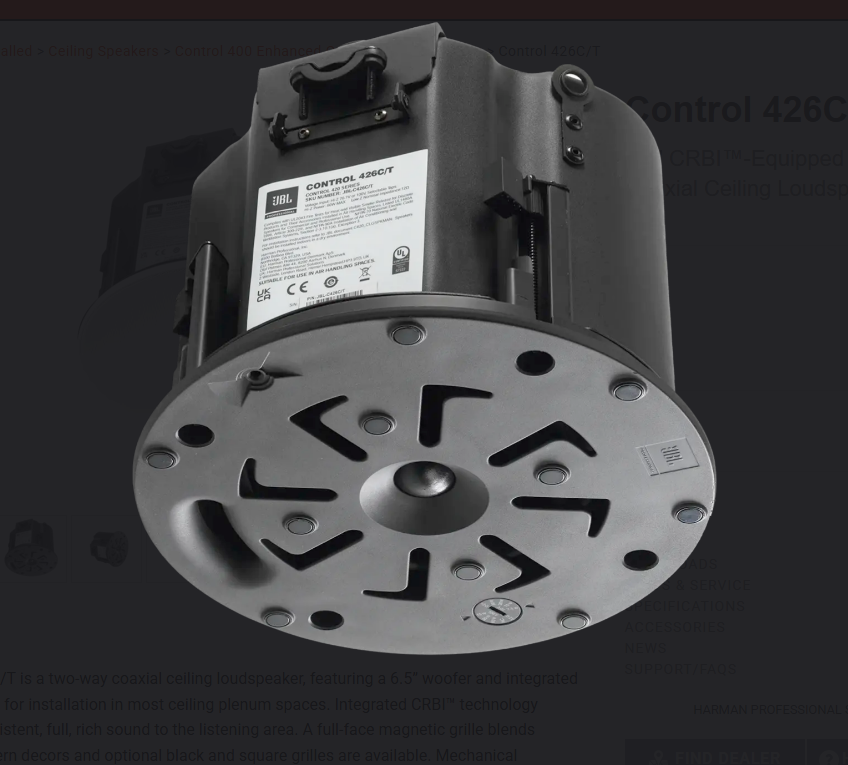 | Optional Accessories | JBL-MTC-426BG black (RAL9004) round grille JBL-MTC-426SG white (RAL9003) square grille JBL-MTC-426NC new construction bracket JBL-MTC-426MR mud-ring construction bracket JBL-MTC-48TRX4 tile rail for 4' x 4' ceiling tiles |