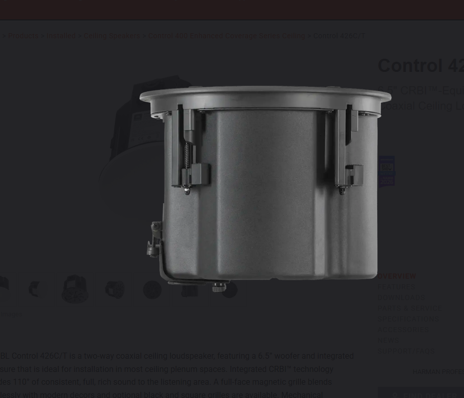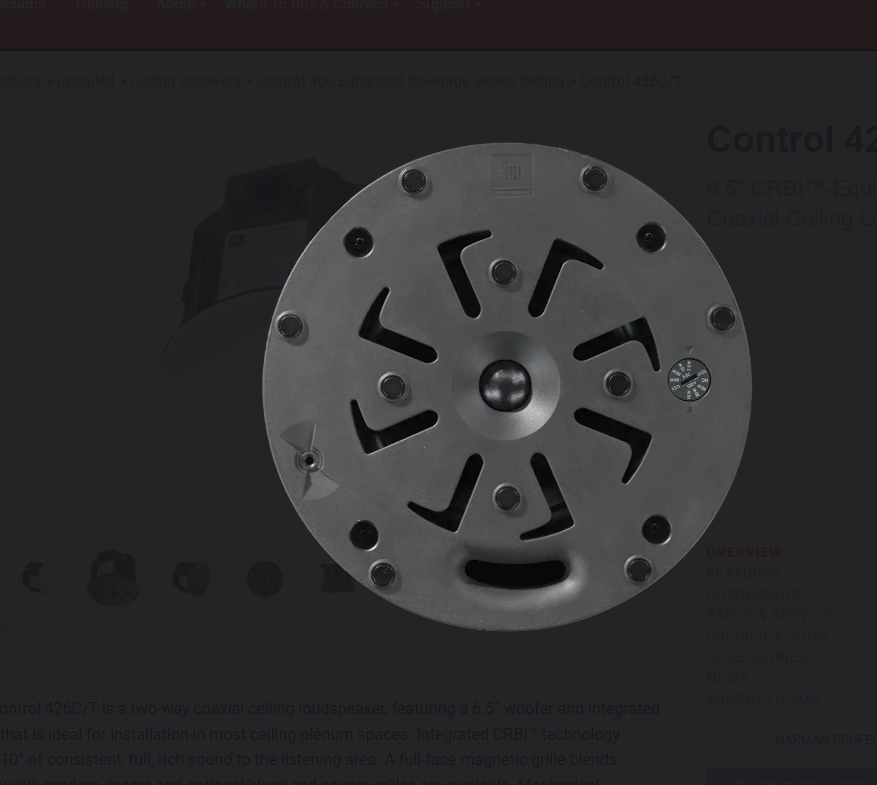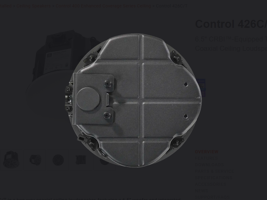 The JBL Control 426C/T is a two-way coaxial ceiling loudspeaker, featuring a 6.5” woofer and integrated enclosure that is ideal for installation in most ceiling plenum spaces. Integrated CRBI™ technology provides 110° of consistent, full, rich sound to the listening area. A full-face magnetic grille blends seamlessly with modern decors and optional black and square grilles are available. Mechanical improvements include redesigned terminal covers with top and side cable entry ports and an extremely reliable new dogear design that works with a wide range of ceiling thicknesses. The JBL Control 426C/T includes a transformer to support both 70V/100V and low impedance applications.