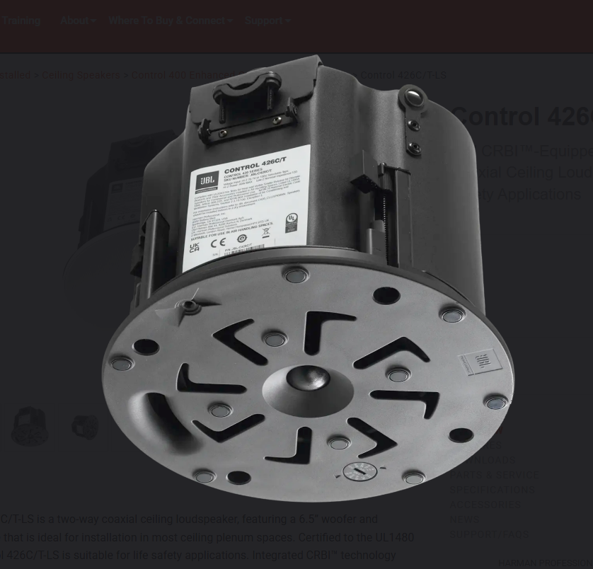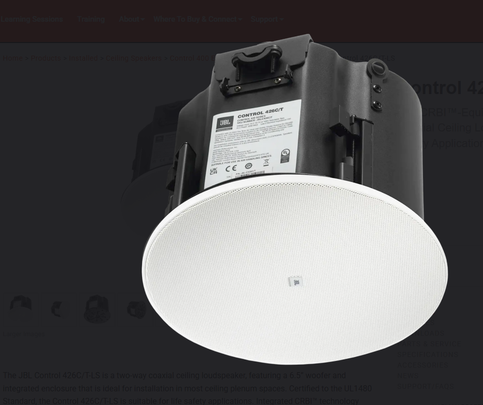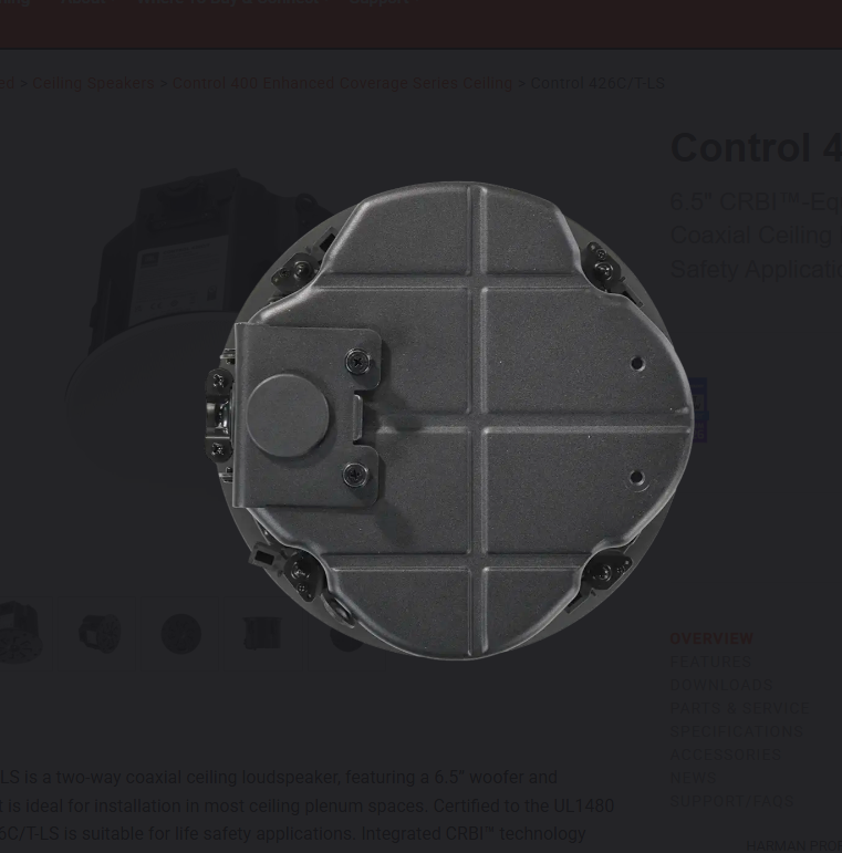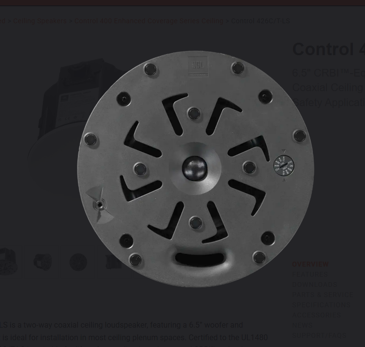 The JBL Control 426C/T-LS is a two-way coaxial ceiling loudspeaker, featuring a 6.5” woofer and integrated enclosure that is ideal for installation in most ceiling plenum spaces. Certified to the UL1480 Standard, the Control 426C/T-LS is suitable for life safety applications. Integrated CRBI™ technology provides 110° of consistent, full, rich sound to the listening area. A full-face magnetic grille blends seamlessly with modern decors and optional black and square grilles are available. Mechanical improvements include redesigned terminal covers with top and side cable entry ports and an extremely reliable new dogear design that works with a wide range of ceiling thicknesses. The JBL Control 426C/T-LS includes a transformer to support both 70V/100V and low impedance applications.