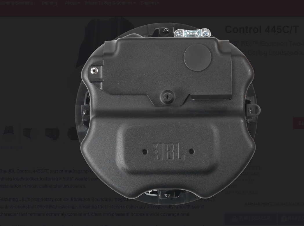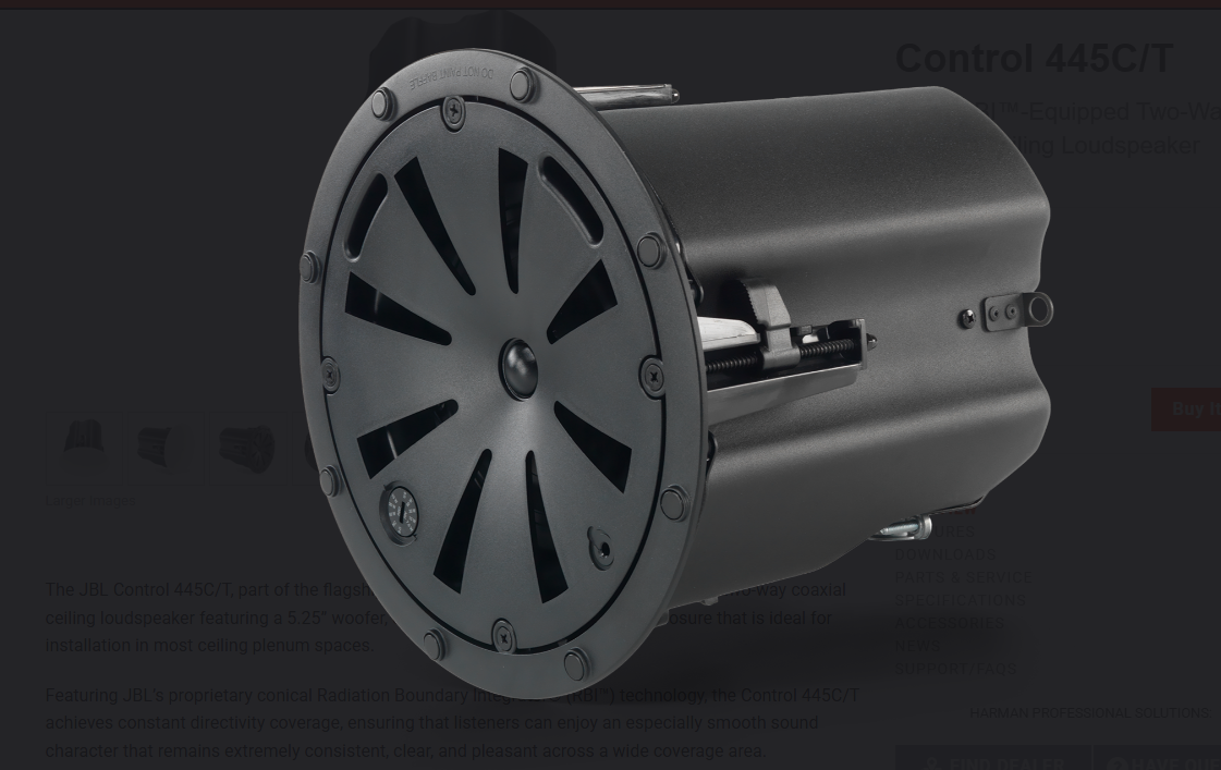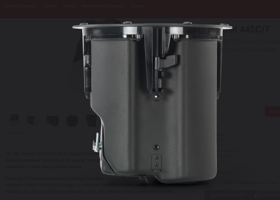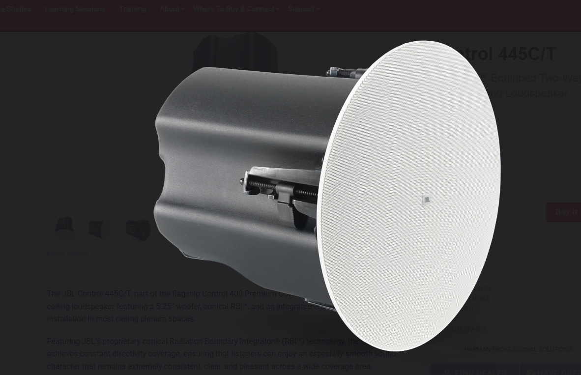 The JBL Control 445C/T, part of the flagship Control 400 Premium Coverage Series, is a two-way coaxial ceiling loudspeaker featuring a 5.25” woofer, conical RBI™, and an integrated enclosure that is ideal for installation in most ceiling plenum spaces.