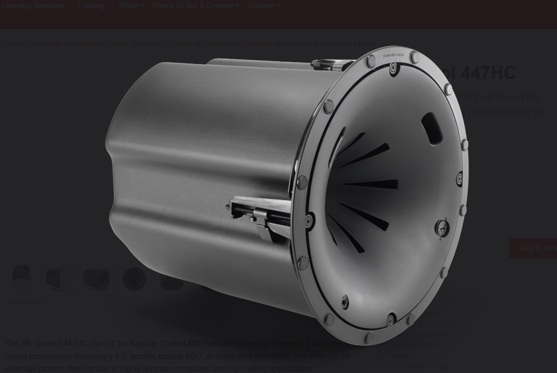 Featuring JBL’s proprietary conical Radiation Boundary Integrator® (RBI™) technology, the Control 447HC achieves constant directivity coverage, ensuring that listeners can enjoy an especially smooth sound character that remains extremely consistent, clear, and pleasant across a wide coverage area.