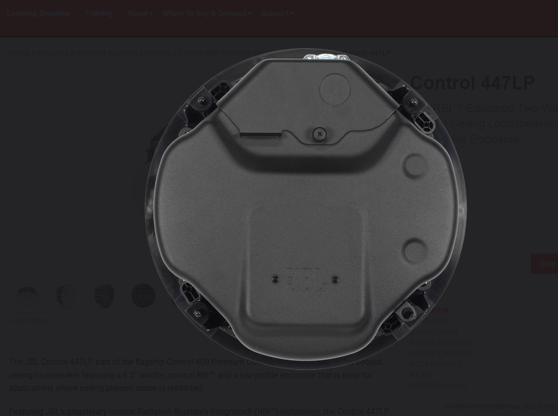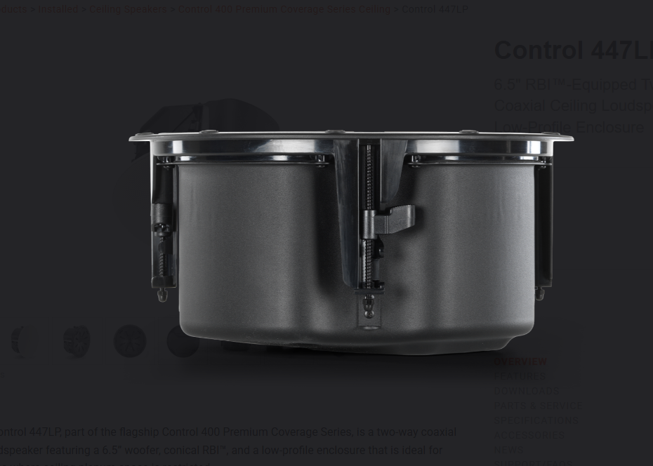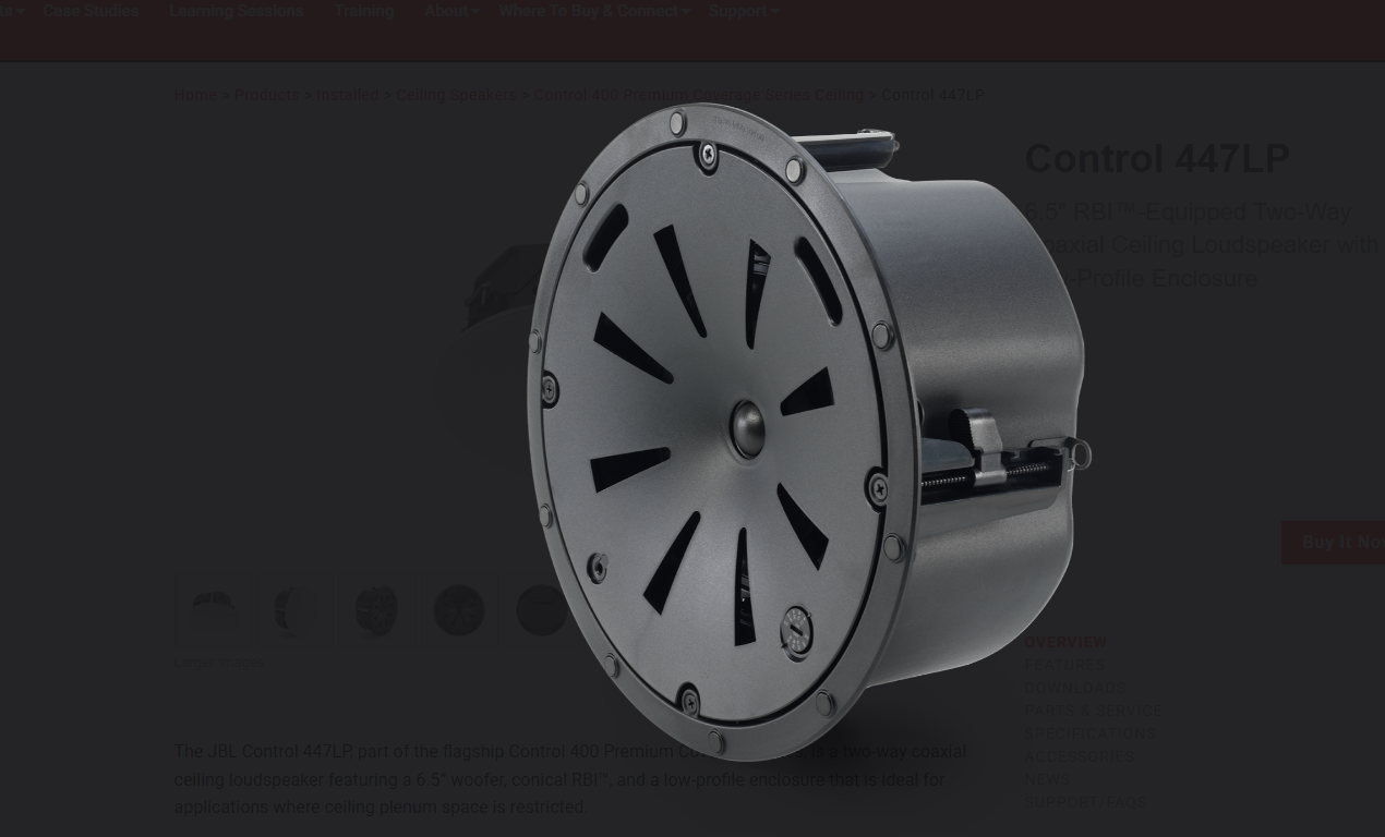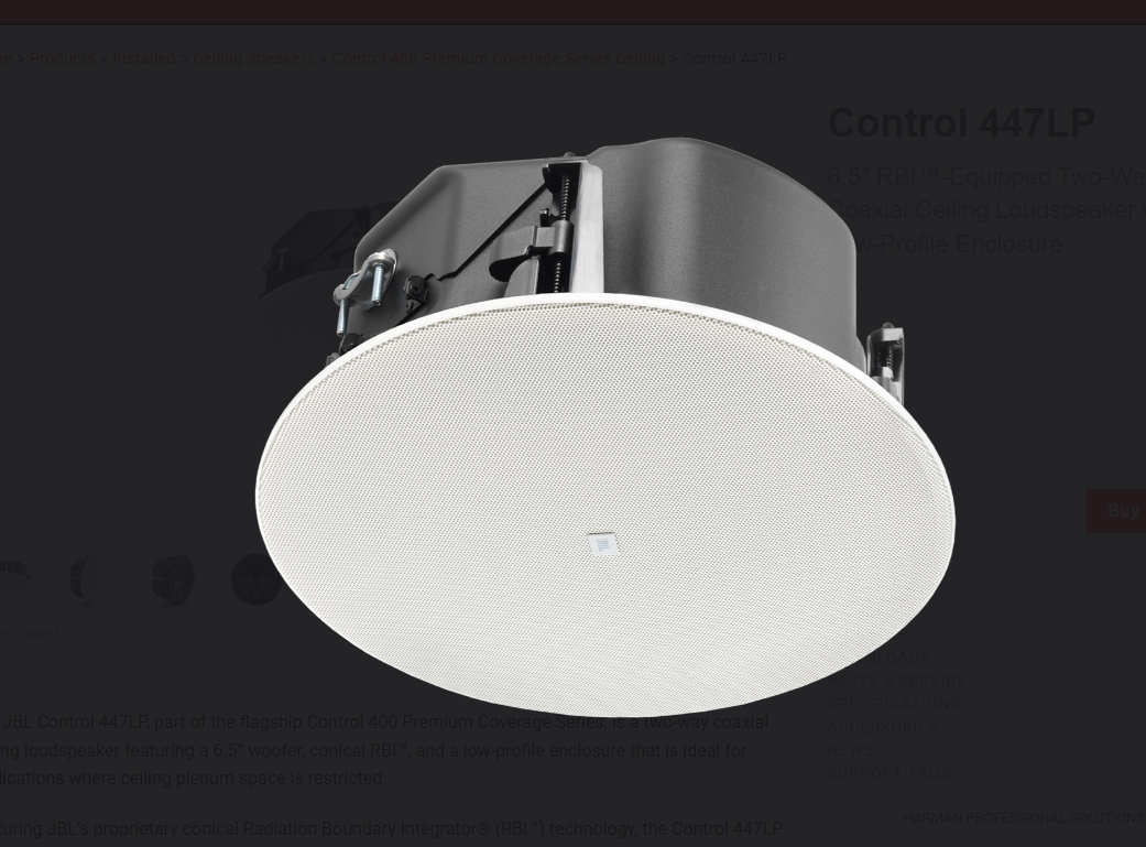 The JBL Control 447LP, part of the flagship Control 400 Premium Coverage Series, is a two-way coaxial ceiling loudspeaker featuring a 6.5” woofer, conical RBI™, and a low-profile enclosure that is ideal for applications where ceiling plenum space is restricted.