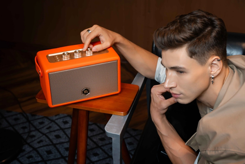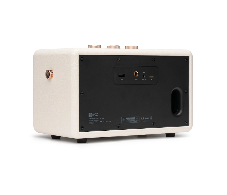 Alpha Works W89 gây ấn tượng với ngoại hình vintage: thân loa bọc da cao cấp, ê-căng kim loại phủ sơn tĩnh điện. Các núm vặn analog giúp tùy chỉnh âm lượng, bass, treble trực quan.