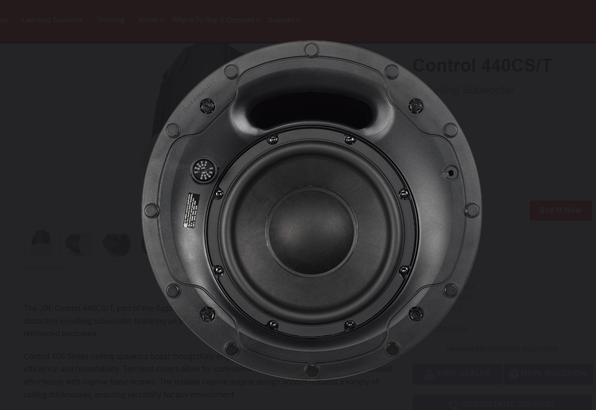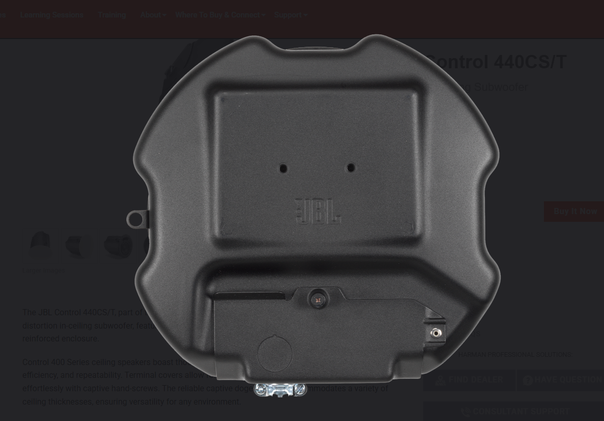 The JBL Control 440CS/T, part of the flagship Control 400 Premium Coverage Series, is a high-power, low-distortion in-ceiling subwoofer, featuring an 8” woofer, passive crossover, and an extremely durable, reinforced enclosure.