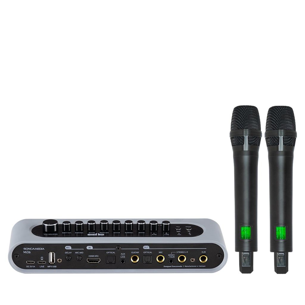 Soncamedia Mi36 nâng cấp ngoại hình full kim loại hoàn thiện chống trầy, chống bám vân tay, vừa tăng tính thẩm mỹ vừa đảm bảo độ bền sử dụng. Mi36 nâng tầm trải nghiệm karaoke với công nghệ “DOUBLE THE DOUBLE” giúp tách riêng giọng hát và nhạc nền để tối ưu từng phần, tạo hiệu ứng dày, vang và chuyên nghiệp như phòng thu. Bộ xử lý số DSP tạo hiệu ứng Echo, Plate Reverb dùng cho phòng karaoke chuyên nghiệp được hiệu chỉnh dễ dàng bằng nút nhấn ngay trên hộp thu.