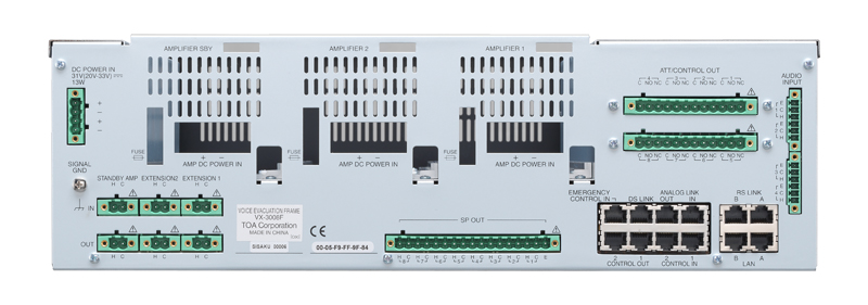 VX-3008F là bộ điều khiển tích hợp 8 vùng loa trong hệ thống âm thanh di tản dòng VX-3000 của TOA. Thiết bị phù hợp với tiêu chuẩn EN54 của châu âu về hệ thống âm thanh báo cháy. Thiết bị được trang bị sẵn các ngõ vào âm thanh và có thể kết nối trực tiếp với các đường ra loa khi chúng ta sử dụng cùng với các mô-đun tăng âm. Thiết bị cũng có thể thiết lập chế độ phát bản tin cảnh báo với mức ưu tiên cao hơn mức cảnh báo thông thường. Hai trạng thái khẩn cấp có thể được kích hoạt trong cùng một thời điểm (Khu vực cháy phát di tản, khu vực lân cận phát cảnh báo). Với đặc tính kết nối qua mạng nên hệ thống có thể bố trí phân tán. Thiết bị bao gồm các đặc tính sau: Chức năng xử lý số cho phép điều chỉnh âm thanh từng ngõ vào riêng biệt và từng khu vực ra, chức năng chống phản hồi âm giúp giảm thiểu tiếng hú trong hệ thống PA, VOX là chức năng cho phép START/STOP thông qua tín hiệu âm thanh vào, chức năng ANC cho phép điều chỉnh âm thanh hệ thống theo độ ồn môi trường. (Chức năng ANC có thể phân biệt âm thanh đầu ra của thiết bị và tiếng ồn xung quanh. Âm thanh đầu ra của thiết bị không được coi là nhiễu). Có đèn hiển thị trạng thái lỗi và trạng thái của từng tăng âm trên bộ tích hợp. Thiết bị có sẵn 8 ngõ ra loa. Số mô-đun tăng âm có thể gắn tối đa vào bộ tích hợp VX-3008F là 3 ( 2 mô-đun để sử dụng, 1 cho dự phòng). Thiết bị là một ma trạn ngõ ra, VX-3008F có thể sử dụng 2 BUS âm thanh thông qua 2 mô-đung tăng âm. Cài đặt ma trận ngõ ra cho BUS-1 và BUS-2 có thể cùng tồn tại ở 1 ngõ ra. Có thể mở rộng vùng loa cần thống báo khi kết nối với bộ VX-3008F khác mà không cần đến Mô-dun tăng âm.. Trên bộ VX-3008F có trang bị sẵn các ngõ vào ra cho tăng âm dự phòng nên thiết bị dễ dàng chia sẽ tăng âm dự phòng với các bộ VX-3000F khác..