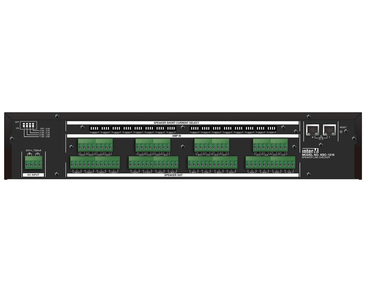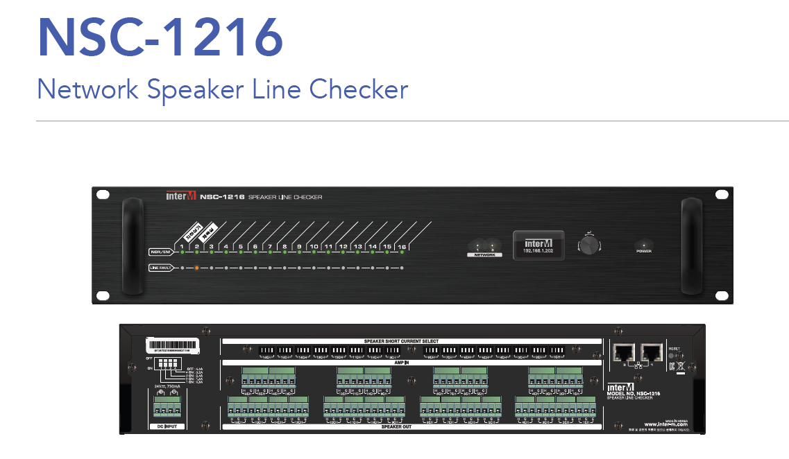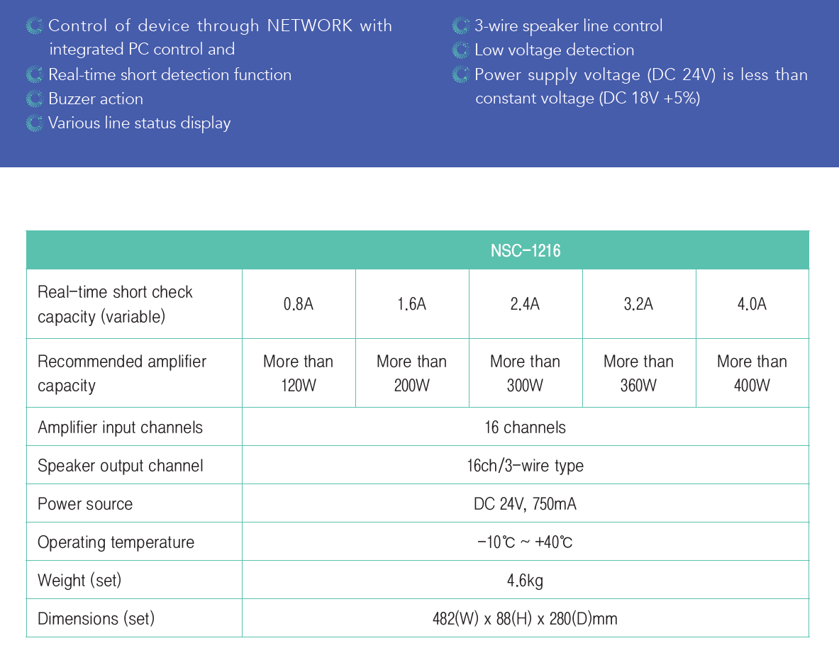 NSC-1216 is a speaker line checker that is controlled through a network in conjunction with our IPC and IPA systems. This is a device that protects the amplifier by automatically blocking the channel when overcurrent occurs due to a short circuit in the line, and informs the operator of the occurrence of an accident.