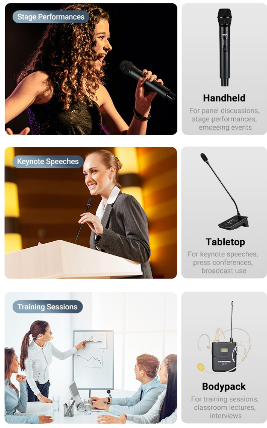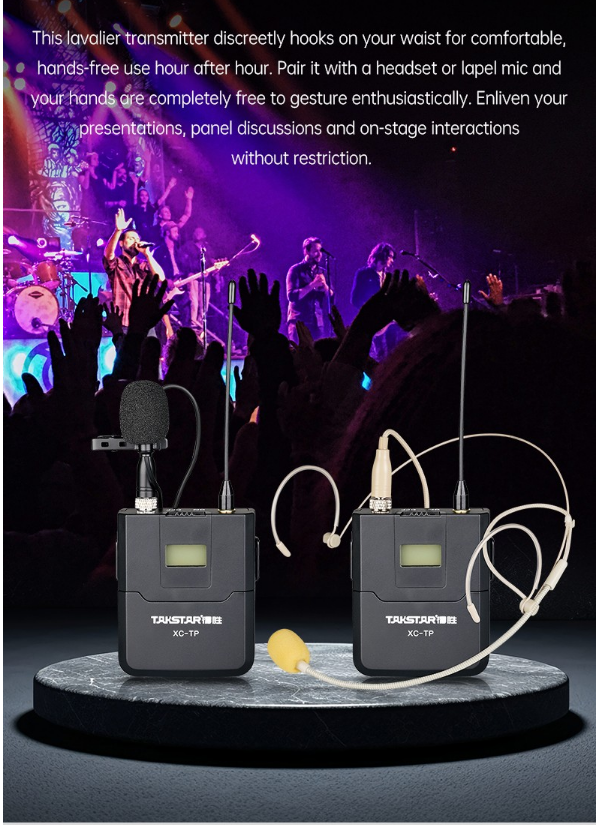 Dùng theo option, kết hợp với micro cầm tay, micro cài đầu hay micro cổ nghỗng không dây