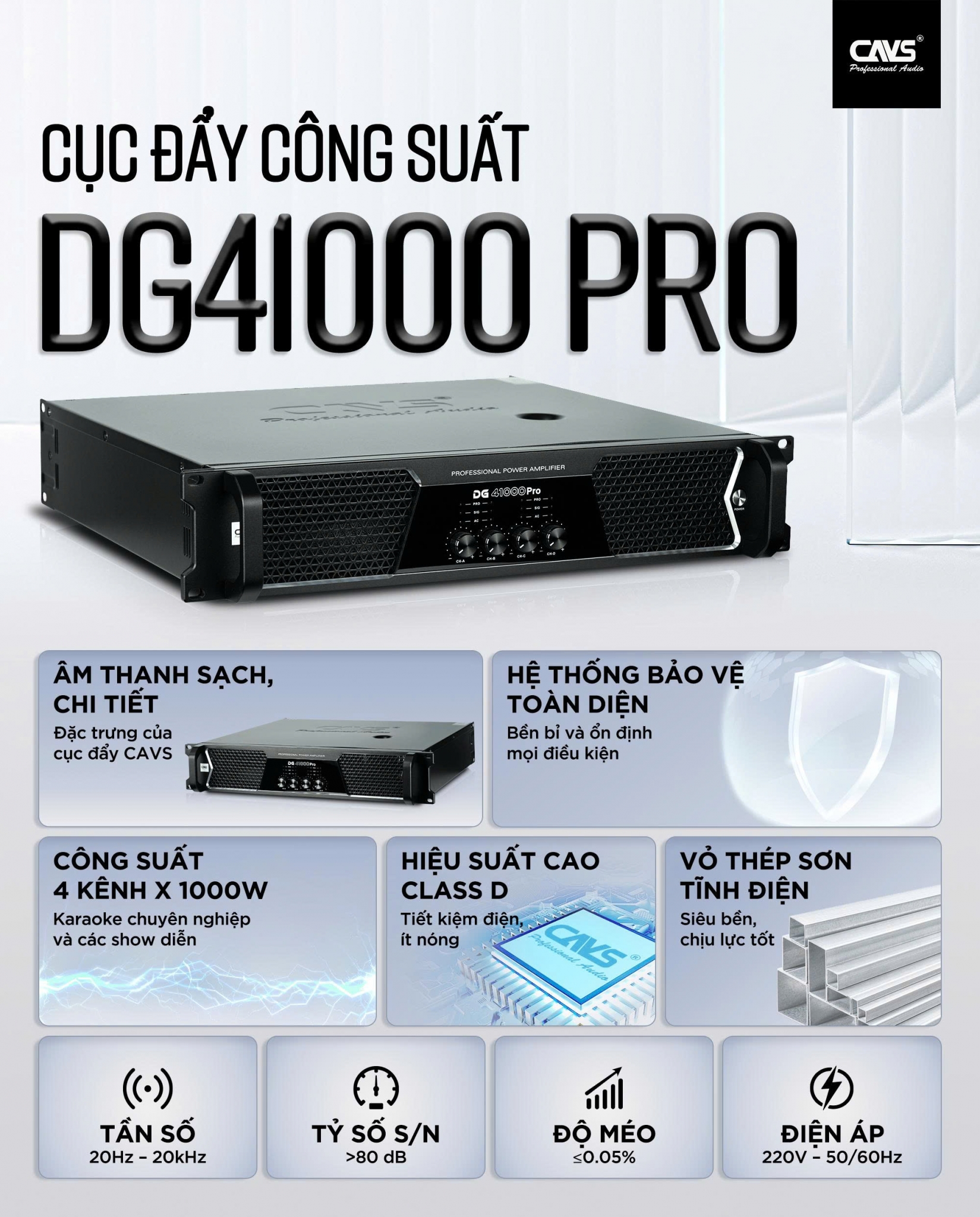 Cục đẩy công suất CAVS DG41000PRO thuộc phân khúc công suất lớn. Với thiết kế 4 kênh riêng biệt, thiết bị cung cấp mức công suất thực (RMS) vô cùng ấn tượng, 1000W/kênh ở chế độ 8 Ohm và có thể đạt tới 1500W/kênh ở chế độ 4 Ohm.