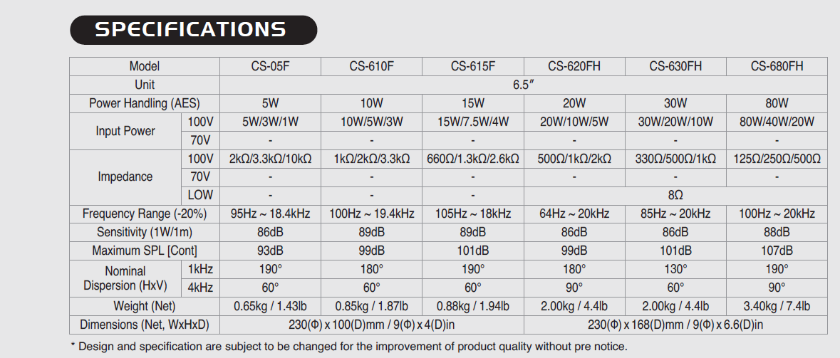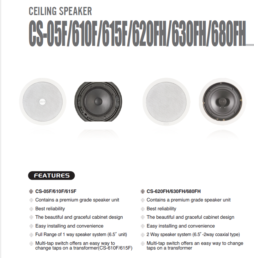 The CS-615F is a ceiling speaker suitable for emergency broadcasting, for preventing the fire from occurring due to the speaker, V-0 grade flame retardant material is used in compliance with international standards. It is recommended for the public construction, firefighting compliance.