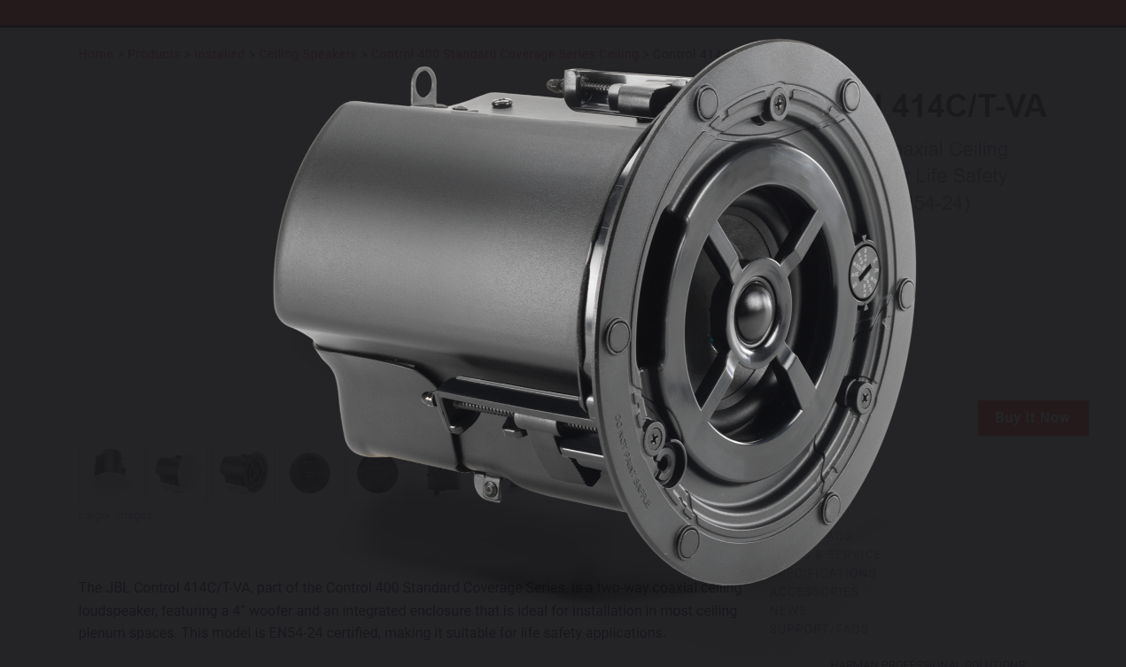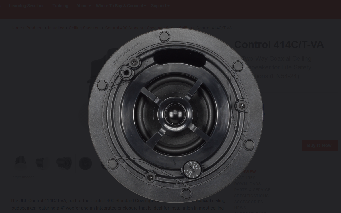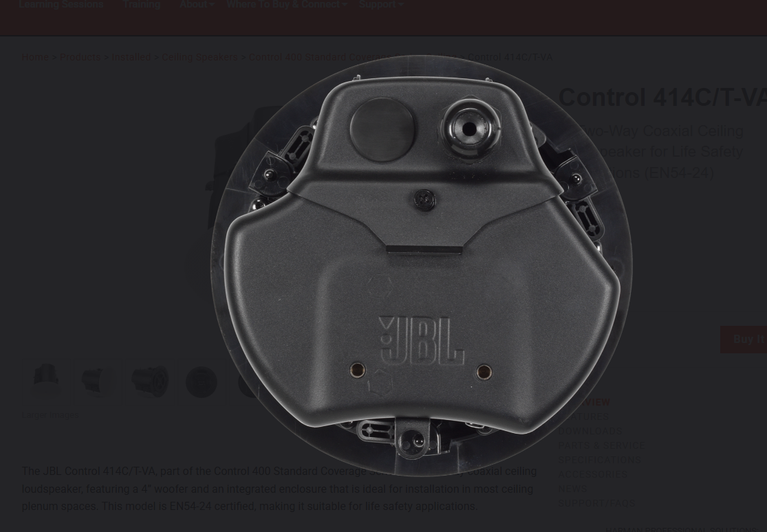 The JBL Control 414C/T-VA, part of the Control 400 Standard Coverage Series, is a two-way coaxial ceiling loudspeaker, featuring a 4” woofer and an integrated enclosure that is ideal for installation in most ceiling plenum spaces. This model is EN54-24 certified, making it suitable for life safety applications.