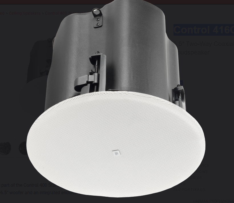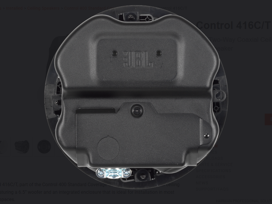 The JBL Control 416C/T, part of the Control 400 Standard Coverage Series, is a two-way coaxial ceiling loudspeaker, featuring a 6.5” woofer and an integrated enclosure that is ideal for installation in most ceiling plenum spaces.