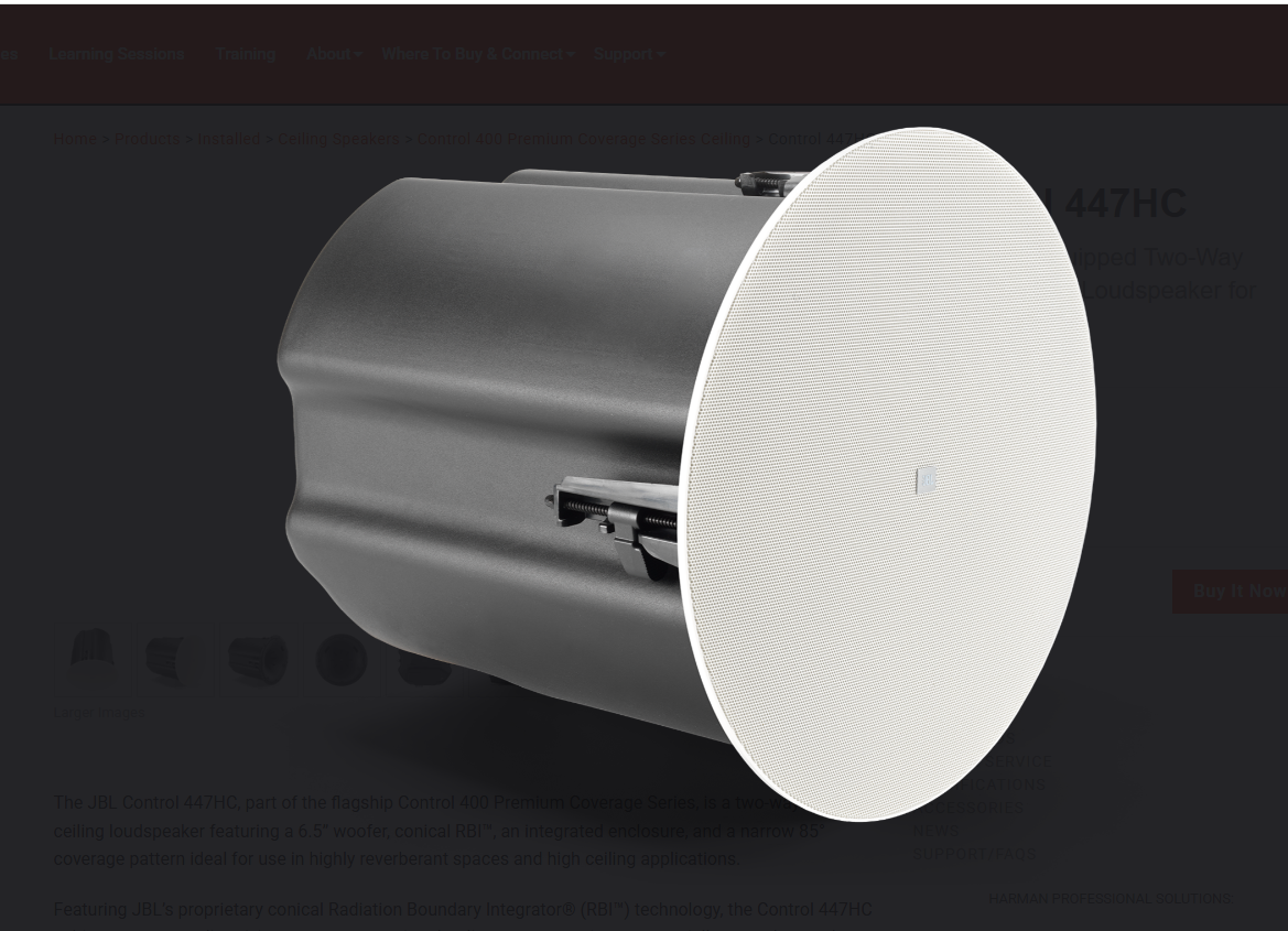 The JBL Control 447HC, part of the flagship Control 400 Premium Coverage Series, is a two-way coaxial ceiling loudspeaker featuring a 6.5” woofer, conical RBI™, an integrated enclosure, and a narrow 85° coverage pattern ideal for use in highly reverberant spaces and high ceiling applications.
