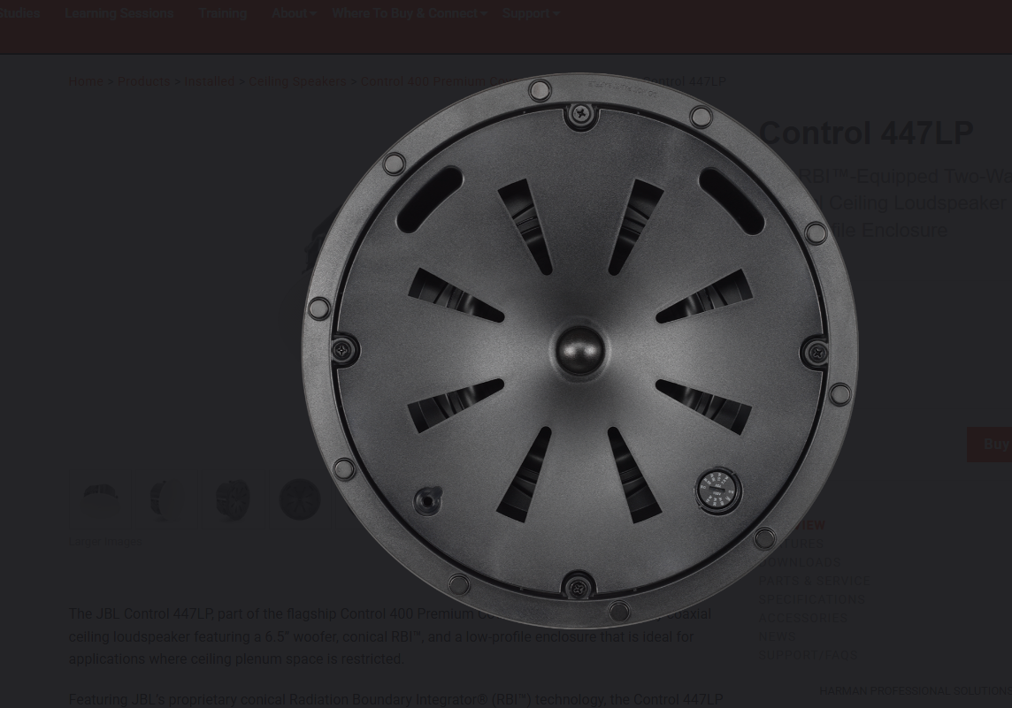 The JBL Control 447LP, part of the flagship Control 400 Premium Coverage Series, is a two-way coaxial ceiling loudspeaker featuring a 6.5” woofer, conical RBI™, and a low-profile enclosure that is ideal for applications where ceiling plenum space is restricted.