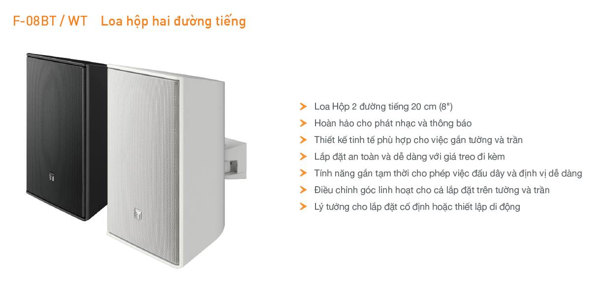Loa hộp F-08WT thuộc dòng loa hai đường tiếng được thiết kế nhằm mục đích mang lại âm thanh chất lượng cao cho nhiều ứng dụng khác nhau. Loa phù hợp phát nhạc nền cũng như phát âm thanh thông báo. Với kiểu dáng đẹp mắt, loa có thể được gắn lên tường hoặc trần nhà và có thể hài hòa với bất kỳ không gian nội thất nào. Thêm vào đó loa còn được cải tiến tính năng lắp đặt tạm thời giúp cho việc lắp đặt đi dây, điều chỉnh góc phân tán trở nên đơn giản, dễ dàng mà vẫn đảm bảo độ an toàn.