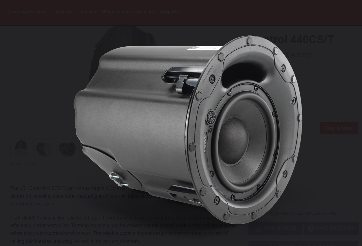 The JBL Control 440CS/T, part of the flagship Control 400 Premium Coverage Series, is a high-power, low-distortion in-ceiling subwoofer, featuring an 8” woofer, passive crossover, and an extremely durable, reinforced enclosure.