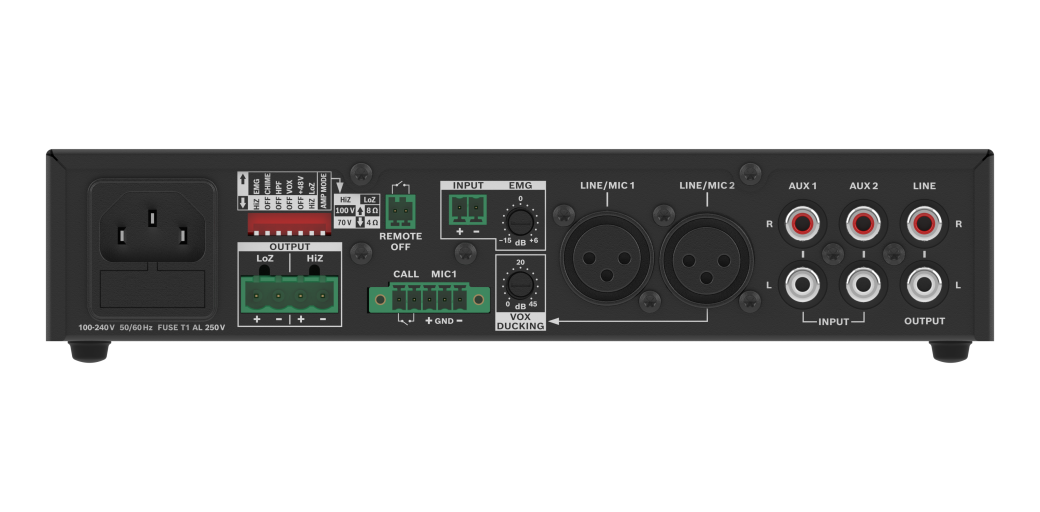 | DIP switches | EMG (HiZ/LowZ), Two-tone Chime (ON/OFF), HPF (120 Hz), VOX (ON/OFF), Phantom power (+48 V/OFF) Output (HiZ/LowZ), Amp mode (70 V/100 V; 4Ω/8Ω) |