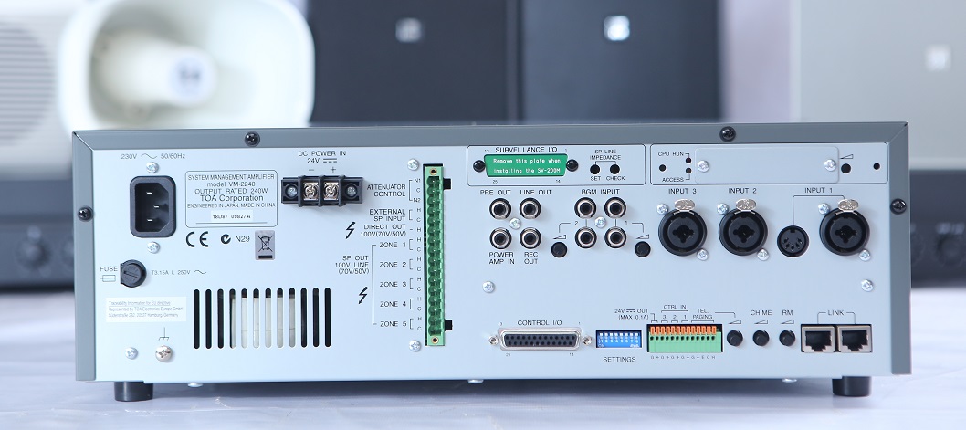 VM2240 là tăng âm "All-in-one" hỗ trợ 5 vùng loa riêng biệt với công suất tối đa lên tới 240W và có thước 3U.. Tăng âm có các ngõ vào âm thanh bao gồm ngõ vào Micro và cho nhạc nền, và ngõ ra loa. Có sẵn 5 núm điều chỉnh âm lượng và phím chọn vùng cho từng vùng loa riêng. Tăng âm không chỉ có chức năng thông báo chung mà còn có chức năng phát thông báo khẩn cấp (*1) dựa trên tiêu chuẩn EN60849 cho phép phát tự động các bản tin cảnh báo trong trường hợp khẩn cấp. Phát thông báo được thực hiện từ micro chọn vùng từ xa giống như từ tăng âm, có thể được điều khiển khiển từ xa từ thiết bị bên ngoài. Ngõ ra 100V/42Ω, có thể được giám sát (*2) với chức năng kiểm tra tự động hệ thống và báo lỗi.