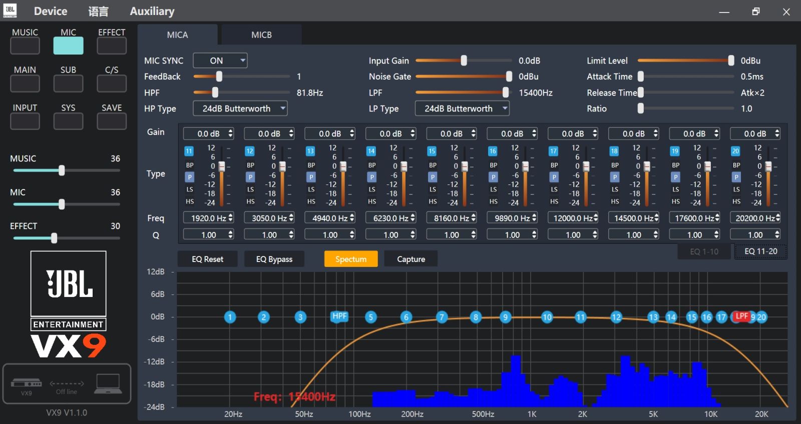 - Cắt tần số HPF và LPF riêng biệt cho cả 3 phần Music, Micro và Effect giúp âm thanh thể hiện chuẩn xác hơn.